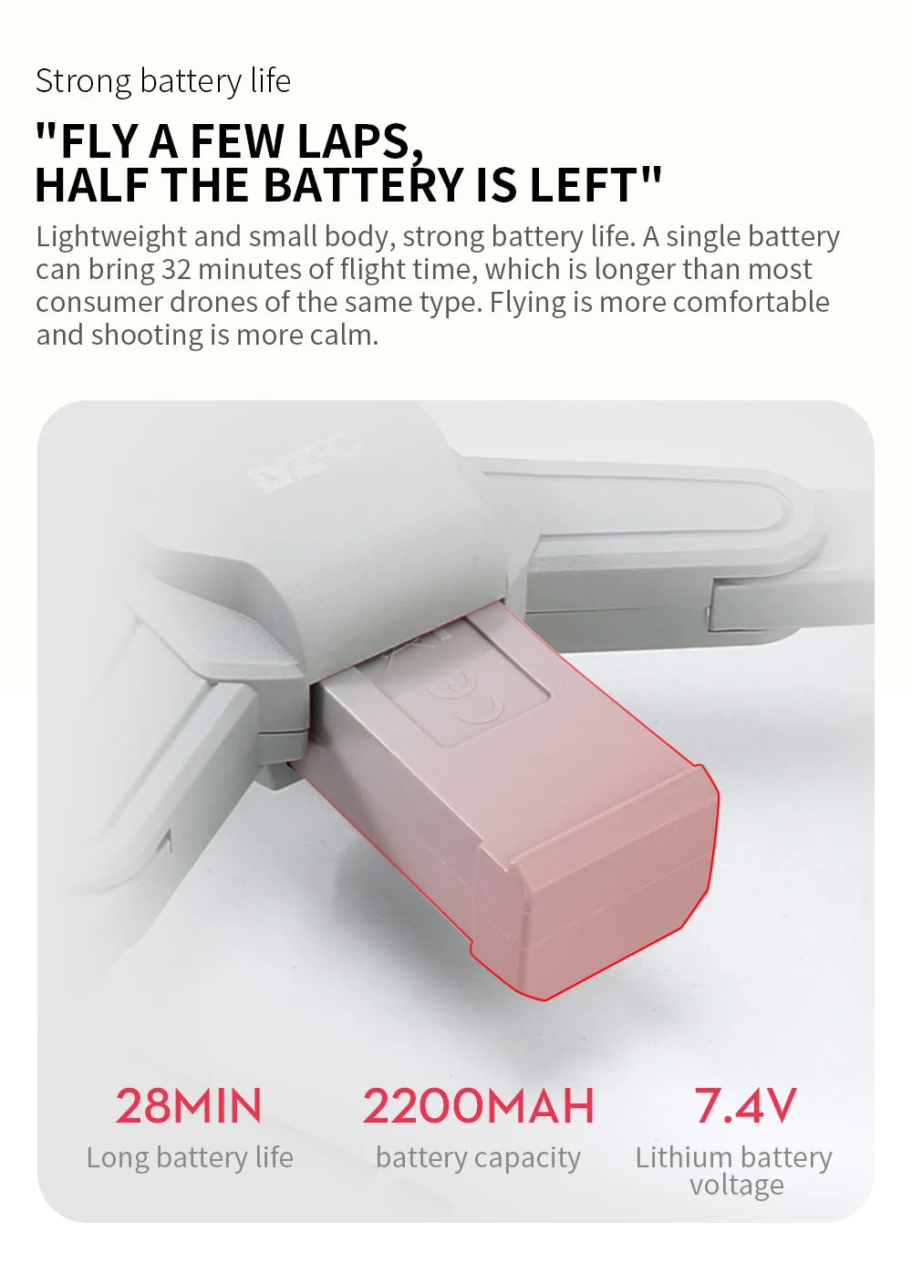 - 28 Mins Max Flight Time.The High-capacity 7.4V 2200mAh intelligent battery yields up to 28mins flight time.