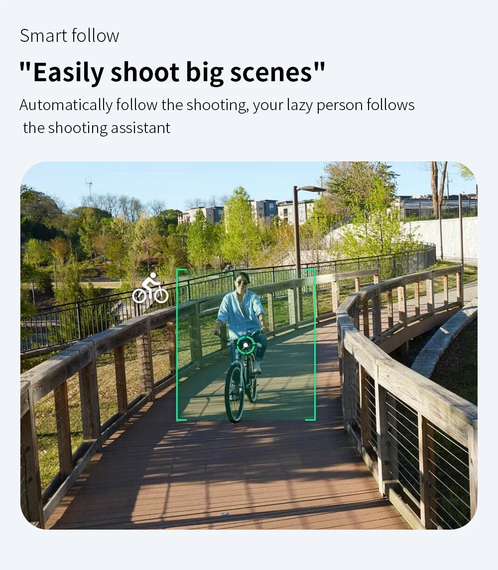 - Follow Me Mode.The drone will automatically follows and captures you wherever you move. Keeping you in the frame at all times, easier to get complex shots, provides hands-free flying and selfie.