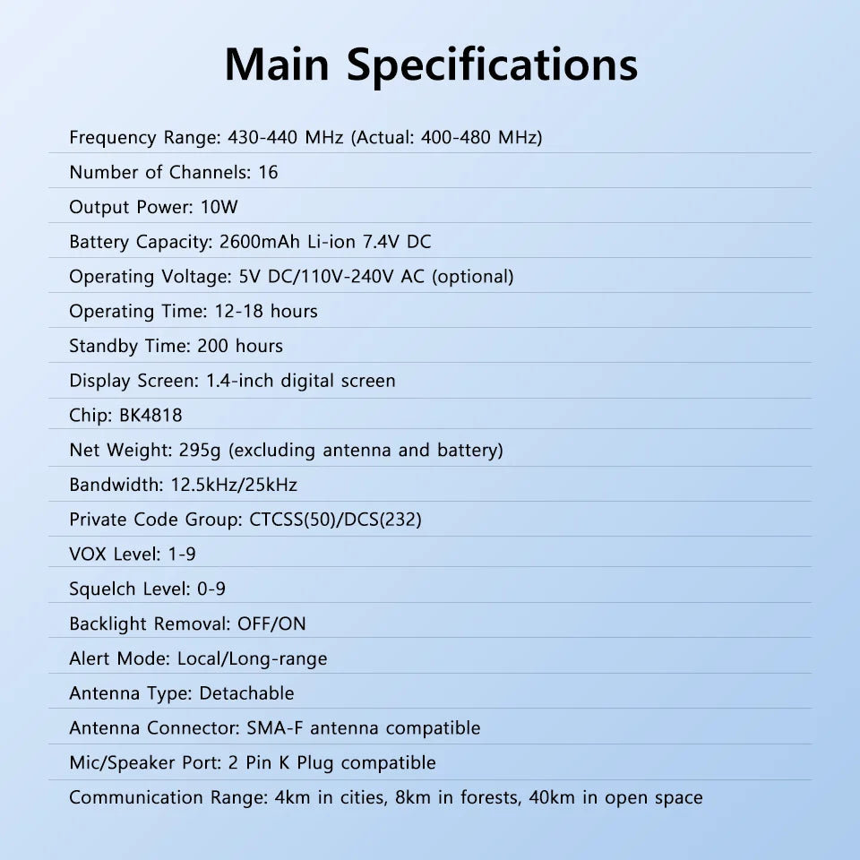 The Retevis RT86 is a professional-grade 10W walkie talkie built for long-range and reliable communication in demanding environments. With powerful UHF transmission, it ensures clear, stable signals over extended distances, making it ideal for outdoor adventures, security teams, construction sites, and business operations. Its high-capacity output provides greater penetration in urban areas and stronger coverage in open spaces.